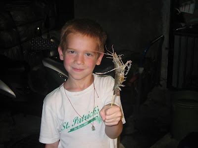 This is a video of Evan and Leone fishing for shrimp at the night market. Nate was trying to take a picture, but he had the camera on video, and he couldn't figure out why it wasn't taking a picture; he had no idea he was filming. You can hear the annoyance in his voice as he tried to figure out the camera. Anyways, we caught some shrimp and they barbequed them up right there, poor little shrimp.